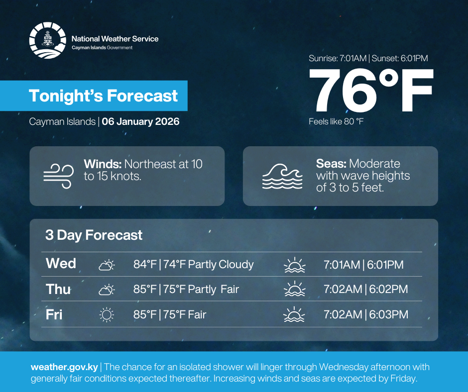 Tonight: Cloudy skies with 30% chance of showers. Temperatures will fall to the mid 70’s °F. Winds will be northeasterly at 10 to 15 knots. Seas will be moderate with wave heights of 3 to 5 feet.