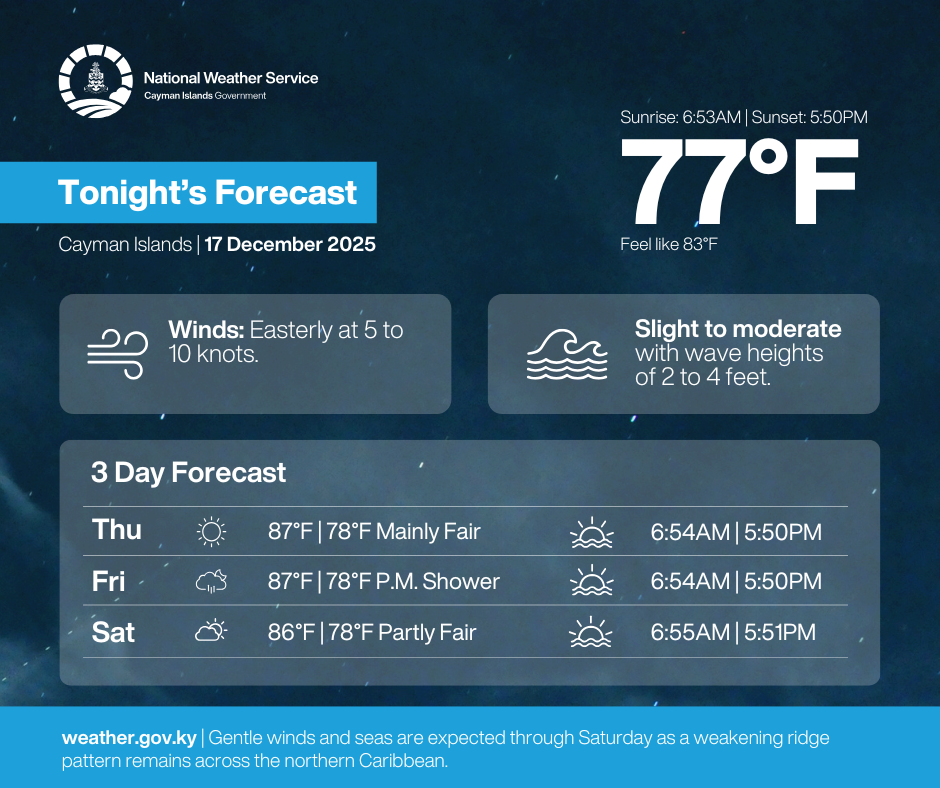 Gentle winds and seas are expected through the next few days in association with a weakening ridge pattern across the northern Caribbean. A low chance for showers remains possible this evening with fair skies expected Thursday as residual moisture slowly moves out of the region. Satellite imagery shows scattered low-level cloud drifting over the Cayman area.