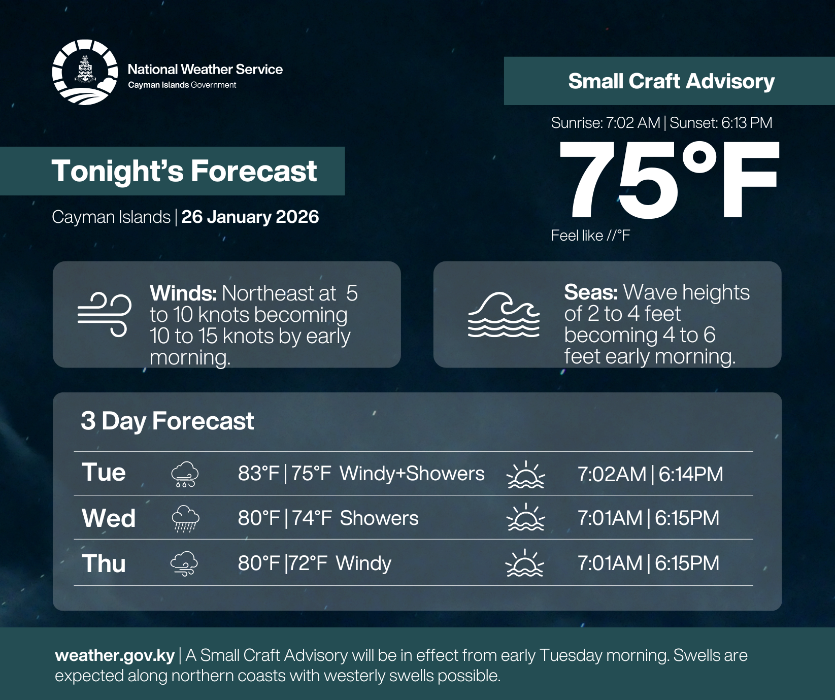 Tonight: Mainly clear skies at first, becoming partly cloudy with a 30% chance of showers after midnight. Temperatures will fall to the mid 70’s °F. Winds will be north to northeast at 5 to 10 knots at first, becoming 10 to 15 knots with higher gusts by the early-morning. Seas will be slight to moderate with wave heights of 2 to 4 feet, becoming moderate to rough with wave heights of 4 to 6 feet by daybreak. Swells are expected along northern coasts with westerly swells possible from the early-morning. A Small Craft Advisory will be in effect from the early-morning.